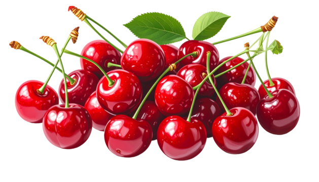 A pile of ripe, red cherries with green stems and leaves, vibrant against black