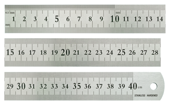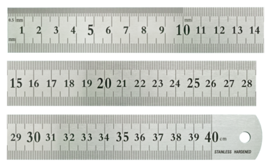 A steel ruler with centimeter and millimeter markings, clearly showing numbers to measure