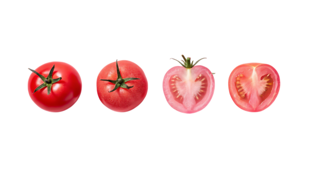 A vibrant quartet of tomatoes, showcasing their juicy redness and perfect ripeness against a clean white background.