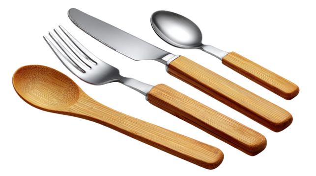 Stylish Cutlery Ensemble: A sophisticated quartet of cutlery, showcasing a refined balance of gleaming metal and warm, wooden accents, poised on a clean, angled perspective.