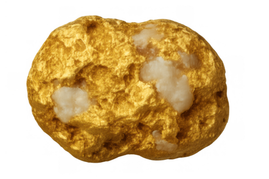 Gold nugget appearing with raw texture and embedded quartz on transparent background, symbolizing wealth and investment