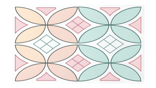 Repeating floral and geometric tile pattern with soft pastel ovals, diamonds, and triangles for textiles and backgrounds