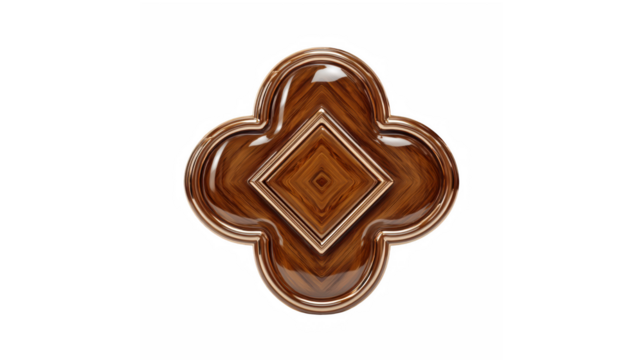 Elegant polished dark wood quatrefoil decorative element with a glossy finish and metallic trim