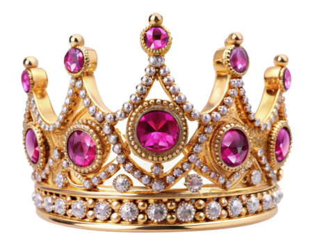 Royal gold crown with pink diamonds isolated on transparent background. Generative AI