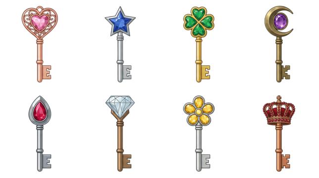 Fantasy magic key set including heart, star, clover, moon, teardrop, diamond, flower, and crown designs. Jewelry and game asset collection.