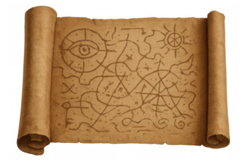 Ancient scroll revealing mystic symbols and esoteric map for treasure hunting concept, isolated on transparent background