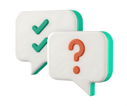 White speech bubble with green checkmark and blue speech bubble with question mark illustration