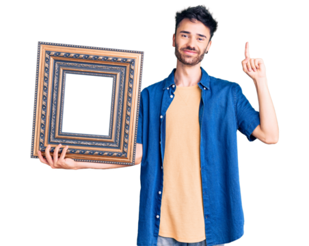 Young hispanic man holding empty frame surprised with an idea or question pointing finger with happy face, number one