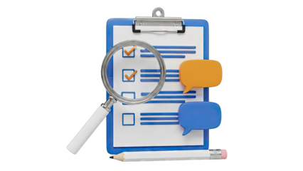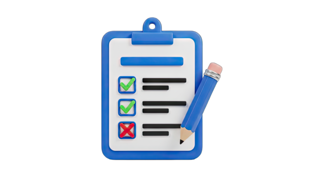 Checklist resting on a clipboard, featuring blue check marks alongside a pen, symbolizing completed tasks or survey questions, isolated against a transparent background