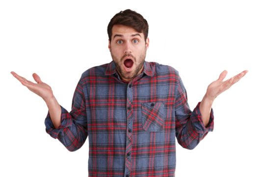 Portrait, confused and wow man with shrug hands, emoji or questions on isolated, transparent or png background. Why, face and male with dont know gesture, doubt or choice, decision and asking option