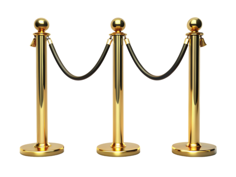 Elegant golden stanchions with blue velvet rope isolated on transparent background