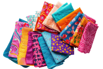 Neat stack of colorful folded fabrics including floral prints, polka dots, and solid colors in rainbow arrangement, isolated on a transparent background