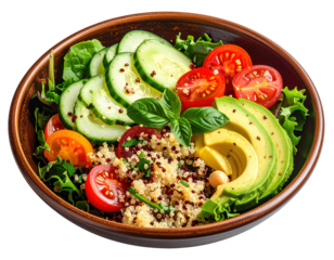 Buddha bowl with quinoa, vegetables, and avocado, isolated on transparent background