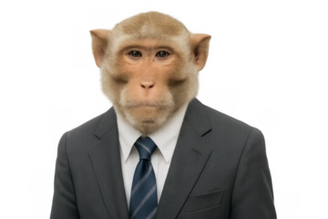 Monkey businessman wearing suit and tie on transparent background, embodying the concept of absurd corporate culture