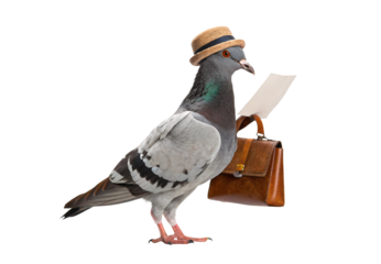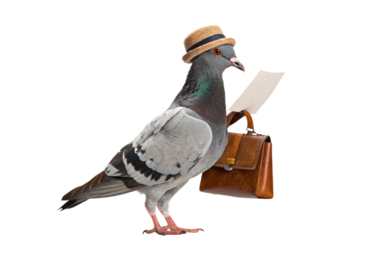 Pigeon wearing straw hat holding paper and brown briefcase businessman, isolated on a transparent background