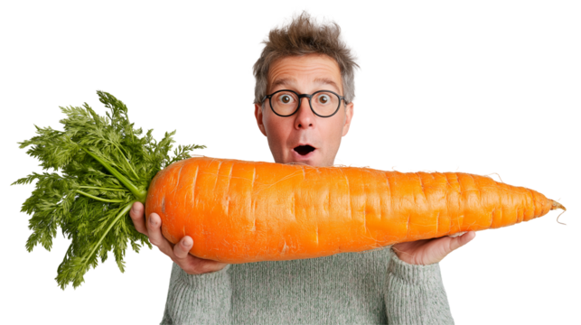 Adult man joyfully holds oversized carrot in a playful display of freshness and fun