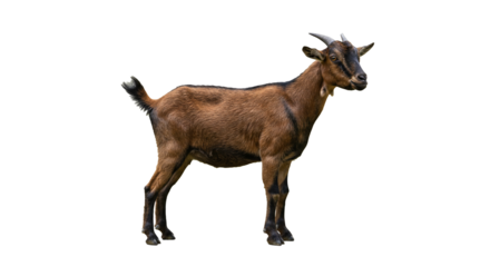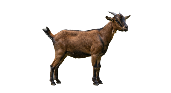 A brown goat stands attentively against a transparent background, its fur catching the light, highlighting the texture and detail of its coat in a clean, modern style that is quite captivating.