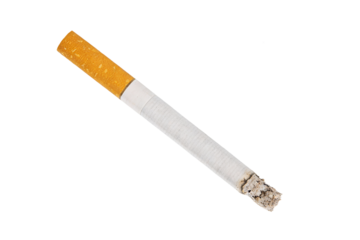 Close-up of a single cigarette with a burned end against a plain white background. Represents smoking, tobacco use, and associated health risks.