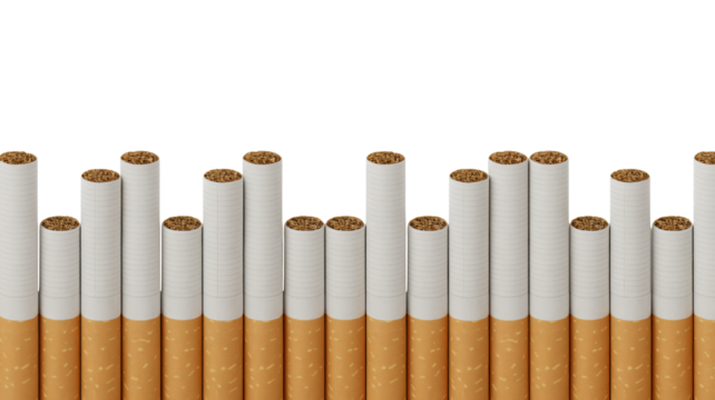 Cigarettes in row formation with filter tips in studio shot on white background for anti-smoking campaign