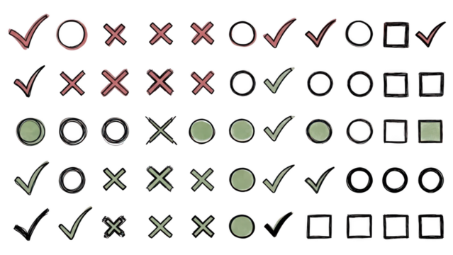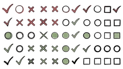 Collection of grunge check mark and cross mark symbols with circles and squares in various styles