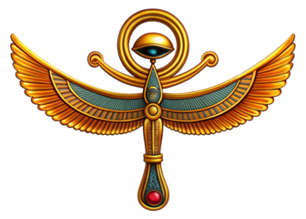 Golden winged scarab beetle holding a sun disk, isolated on transparent background, representing ancient egyptian symbolism