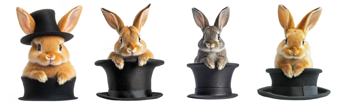 Cute rabbits in magician’s hats looking curious and playful animals and magic transparent background