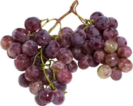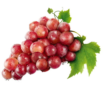 cacho de uva vermelha madura com gotas de água e folha de parreira isolado em fundo transparente