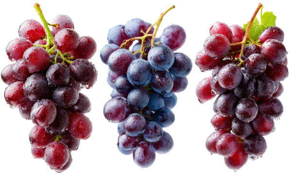 Trois grappes de raisins rouges et noirs fraîches avec gouttelettes