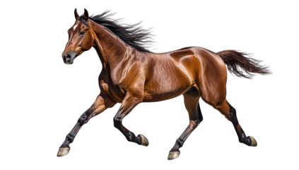 Brown Horse Galloping. A brown horse is seen galloping energetically. Its mane and tail flow behind it in the wind. on a White or Clear Surface PNG Transparent Background.