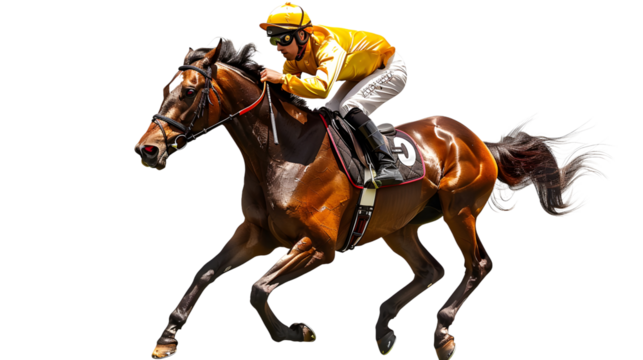 Horse racing .Jockey racing on horse, white background, full body, png photo