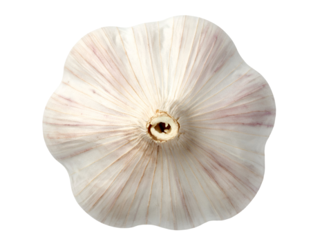 Whole garlic bulb top view showing radial papery skin and dried root base, crisp studio macro on isolated background