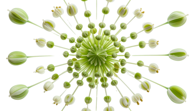 Overhead macro of a central green cluster radiating outwards with budding white florets