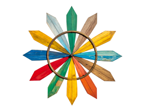 Colorful wooden spokes radiate from a central metal circle