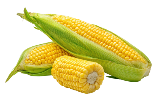 Corn whole cobs arranged radial sunburst pattern on overhead flatlay, golden kernels and green husk tips forming vibrant spokes under balanced studio light, isolated on transparent background