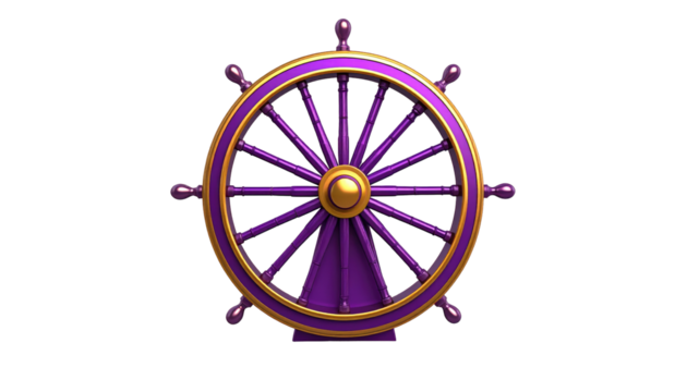 Purple and gold wheel with radiating spokes, reminiscent of nautical or decorative design, on a black background