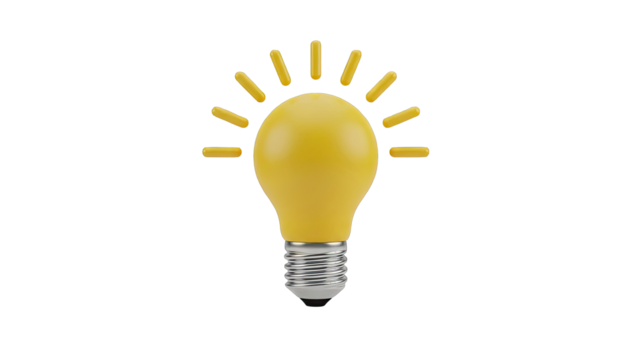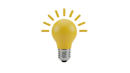 Yellow light bulb with radiating lines on a white background
