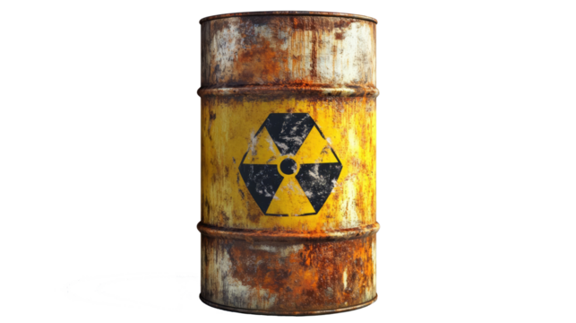 Rusty yellow barrel with radioactive symbol displayed against a white background