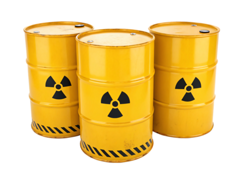 Radioactive waste yellow barrels with radioactive symbol isolated on white and transparent background, cut out png