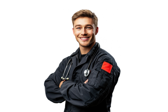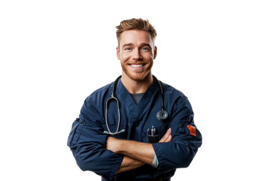 Cheerful American male nurse portrait, front view, isolated on a white transparent PNG cutout background, with professional softbox lighting for a clean, bright appearance.
