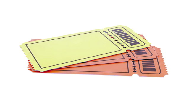 Yellow admission tickets isolated on transparent background, vintage paper entry passes for cinema, concert, carnival, or theater, retro ticket stubs for event design and decoration