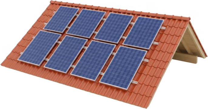 Eight blue photovoltaic solar panels mounted securely on a pitched terracotta roof structure with visible wooden rafters underneath renewable energy rooftop energy generation transparent background