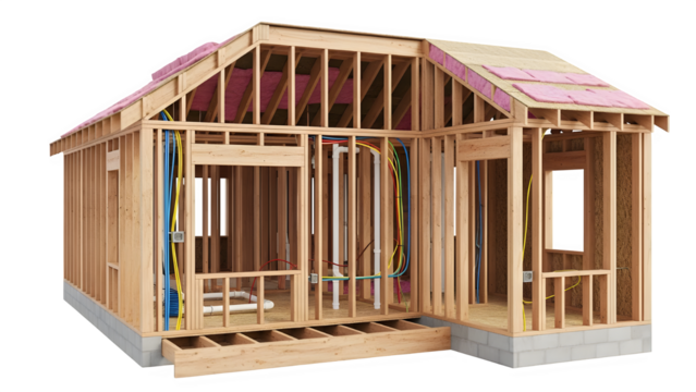 Wood frame house construction skeleton with insulation and wiring visible isolated on transparent background