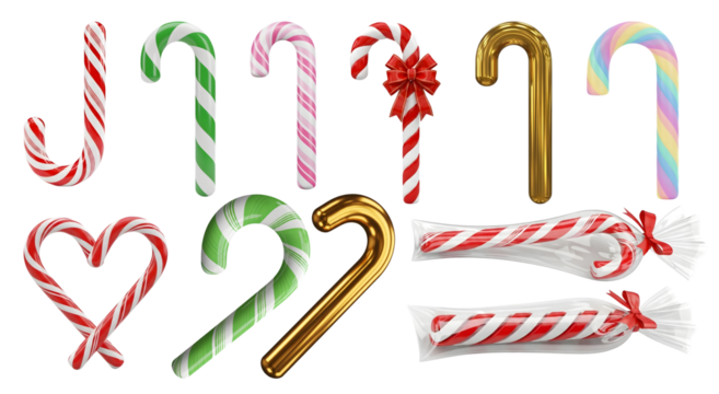 A delightful assortment of festive candy canes in traditional red white green pink rainbow and gold with a heart shape and wrapped versions on a black background
