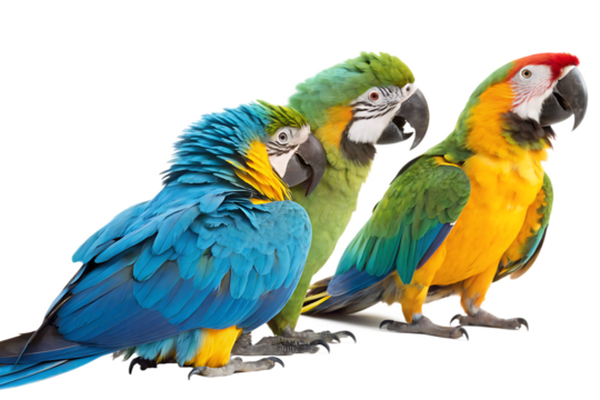 Three vibrant lorikeets perched side by side in a studio setting transparent background