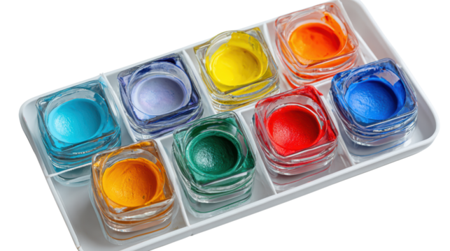 A vibrant palette with eight colors in glass containers on a white isolated background.