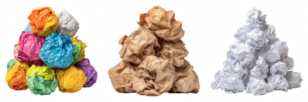 Pile of Multicolored Wrinkled Crumpled Paper Sheets Colorful, white, brown Collection Transparent Background