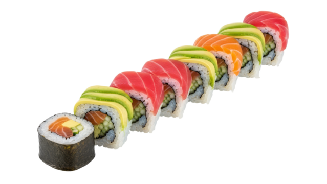 Rainbow sushi roll with fresh seafood on a transparent background, showcasing vibrant colors and japanese cuisine