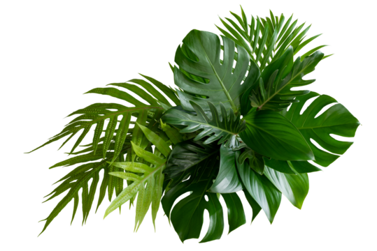 A lush jungle fern cluster, isolated on transparent background .  Green leaves of tropical plants bush .Monstera, palm, rubber plant, pine, floral arrangement indoors garden nature backdrop isolated