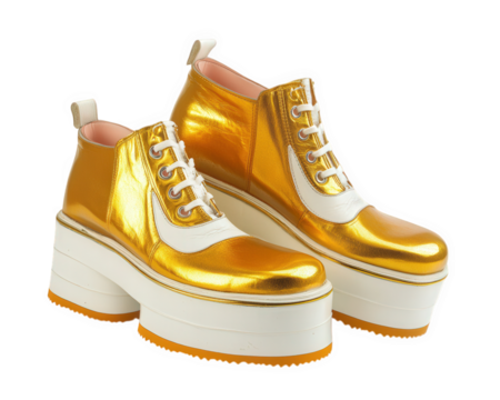pair of platform shoes featuring bold 70s design in vibrant gold with white accents, perfect for making statement. These stylish shoes combine retro flair with modern comfort