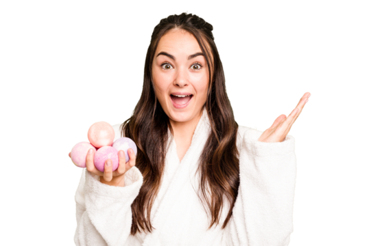 Young caucasian woman holding aromatic balls for bathtub isolated on green chroma background receiving a pleasant surprise, excited and raising hands.